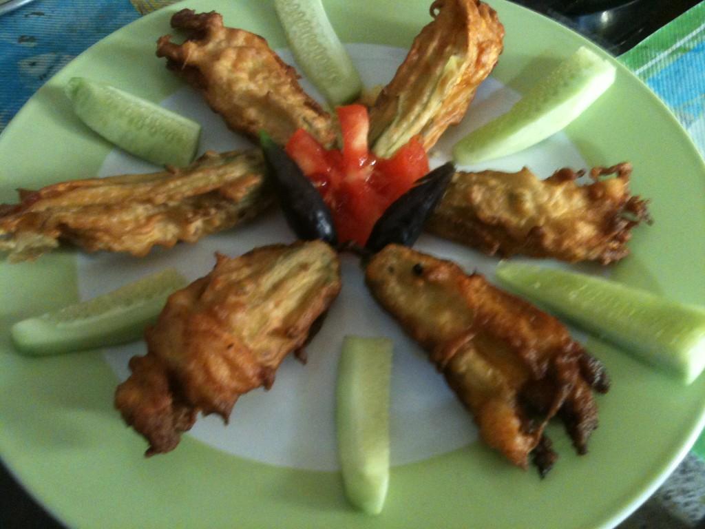 Make a smooth paste of besan,cumin powder,turmeric powder,green chilly,salt with water. Hat oil in a wok,dip the flowers into the batter and deep fry until golden brown. serve hot with green chutney,salad and hot tea.